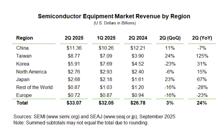 2025년 2분기 글로벌 반도체 장비 매출 330억불…전년比 24% ↑
