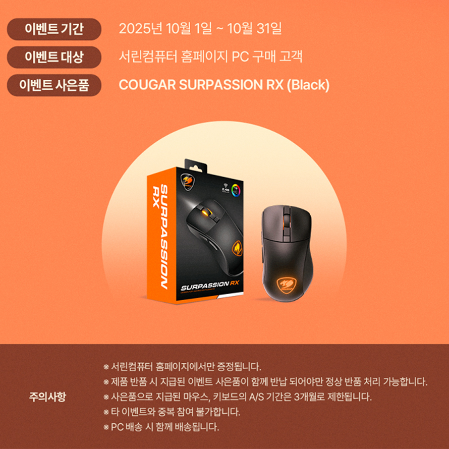 이번 이벤트의 사은품은 쿠거(COUGAR)의 ‘서패션 RX 블랙(SURPASSION RX BLACK)’ 무선 게이밍 마우스로, 2.4GHz 무선 연결과 유선 연결을 모두 지원한다. 인체공학적 디자인과 정밀 센서, 실시간 DPI 조절, 온보드 저장 기능(전용 소프트웨어 호환) 등을 갖춰 게임과 업무 모두에 적합한 성능을 제공한다.