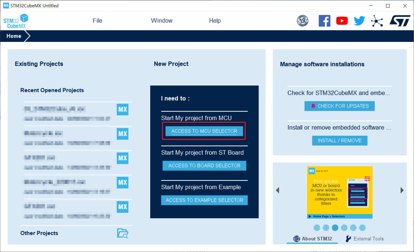 - STM32CubeMX의 Help > Manage embedded software packages 클릭