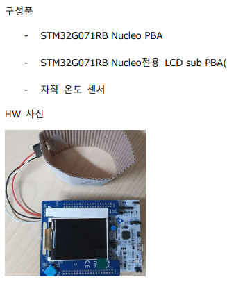 미션 수행 내용 요약 : 직접 만든 온도 센서 보드를 stm32G07X 보드에 연결하여 온도 측정치를 LCD화면에 출력하도록 구현해 보았습니다. 자작 온도 센서는 아날로그 전압값을 출력하여 MCU로 입력해 주기 때문에 ADC를 이용하여 아날로그 값을 수신하였고 수신된 전압수치를 온도값으로 환산한 값을 LCD화면에 출력하였 습니다