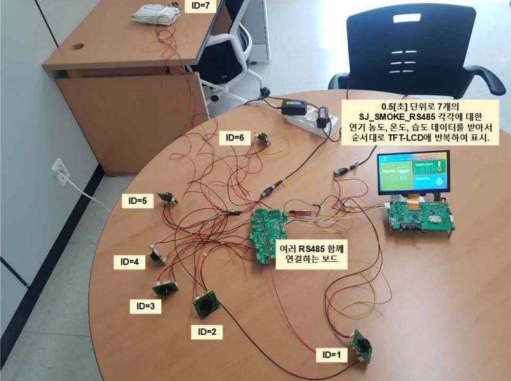 7대의 SJ_SMOKE_RS485 RS-485 멀티드롭 실험 구성