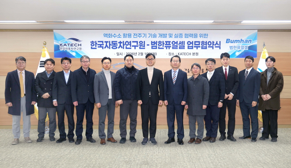 한국자동차연구원은 지난 10일 충청남도 천안시 풍세면 한국자동차연구원 본원에서 범한퓨얼셀과 ‘액화수소 활용 전주기 기술 개발 및 실증 협력을 위한 업무협약(MOU)’을 체결했다고 11일 밝혔다. 협약식에는 진종욱 한국자동차연구원 원장과 황정태 범한퓨얼셀 대표이사를 비롯해 양 기관 관계자 20여 명이 참석했다.