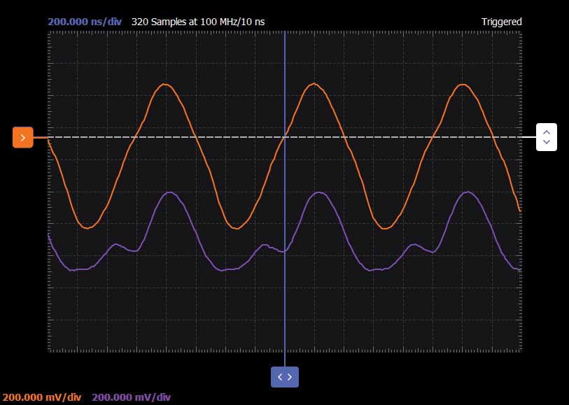 두 개의 오실로스코프 입력을 모두 200mV/div로 설정하고, 시간 기준은 1μs/div로 설정한다. 채널 1의 상승 엣지 상에 트리거를 설정한다. 브레드보드 회로는 그림 4를 참고하면 된다.