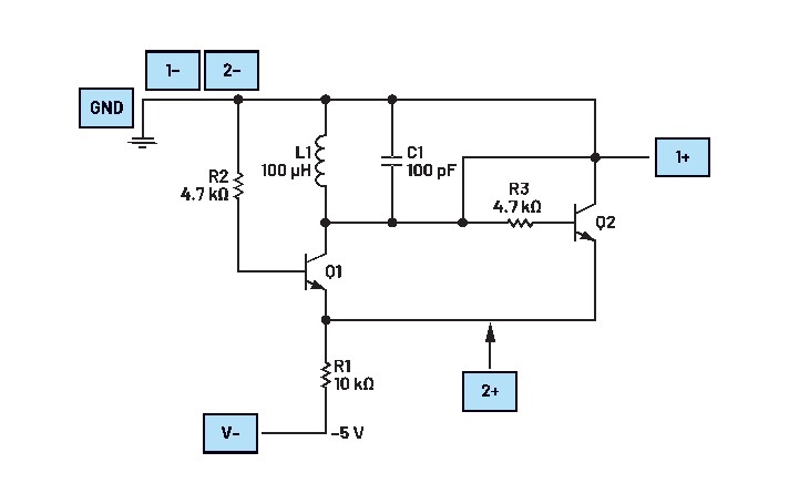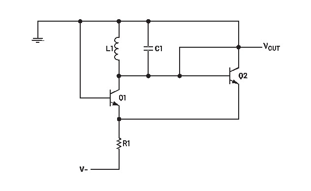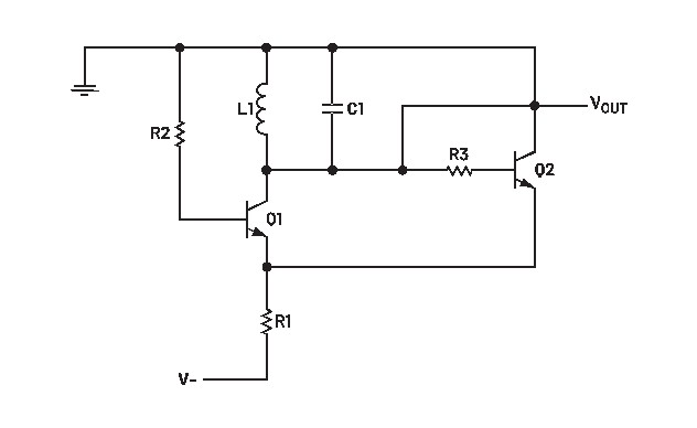 L1과 C1으로 이루어진 공진 탱크는 컬렉터 부하를 제공한다. 컬렉터에서의 출력은 이미터 팔로어(공통 컬렉터) 단으로 구성된 트랜지스터 Q2의 베이스로 전달된다.