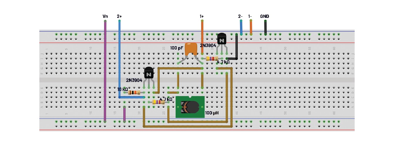 솔더리스 브레드보드를 사용해 그림 3에 제시된 펠츠 오실레이터 회로를 구성한다. 사각형 표시는 ADALM2000 모듈의 오실로스코프 채널과 전원 공급 장치를 연결할 위치를 나타낸다. 전원 공급 장치를 켜기 전에 반드시 배선을 한 번 더 확인한다.