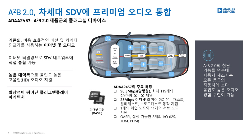 ADI는 A²B 2.0이 프리미엄 등급뿐 아니라 엔트리 레벨 차량에서도 프리미엄 오디오 제공을 가능하게 한다고 강조했다.
