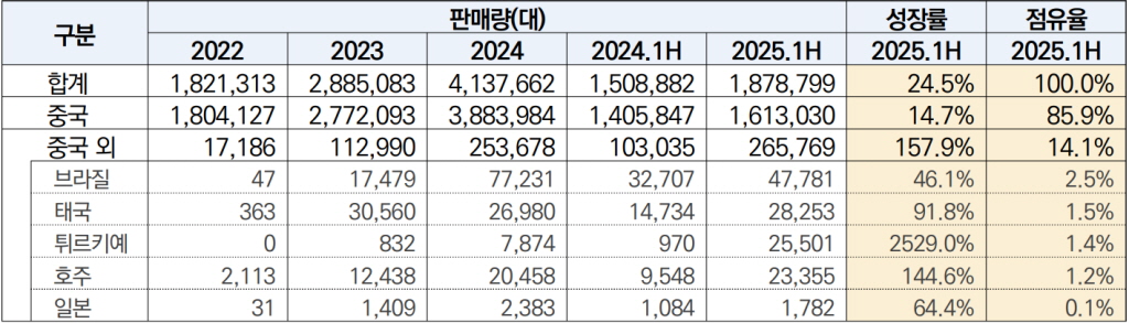 2024년 2,383대, 2025년 상반기 1,782대로 전체 승용차 시장 점유율은 0.08%에 불과하다.