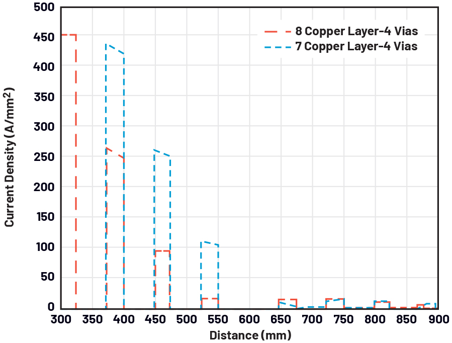 그러나 7번, 6번, 5번 하위층의 전류 밀도는 8개의 구리층이 존재하는 경우보다 크게 증가한다.
