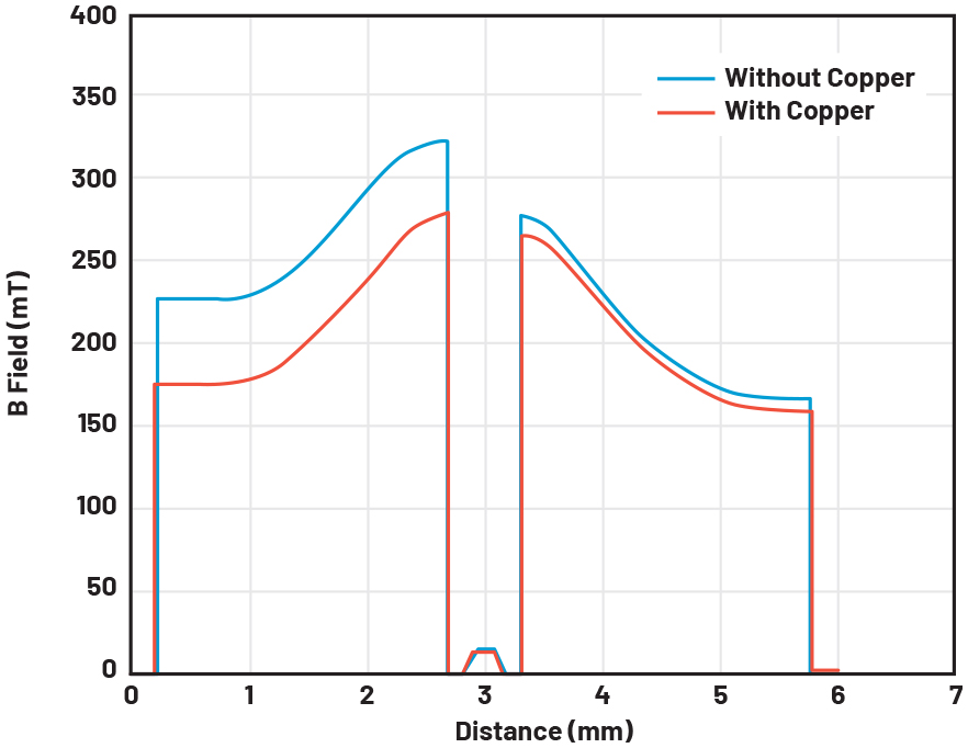 그림 4b는 B-필드 분포 그래프로, 누설 자속이 구리층에 의해 억제되는 모습을 보여준다.