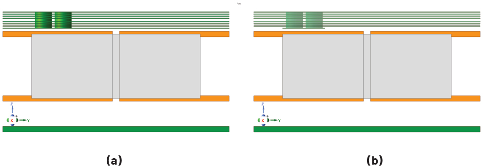 반면, 그림 1b에서는 기판에 일반적으로 존재하는 구리층을 표현하기 위해, 코어 위아래에 두께 200µm의 구리층(녹색)을 추가로 배치했다.