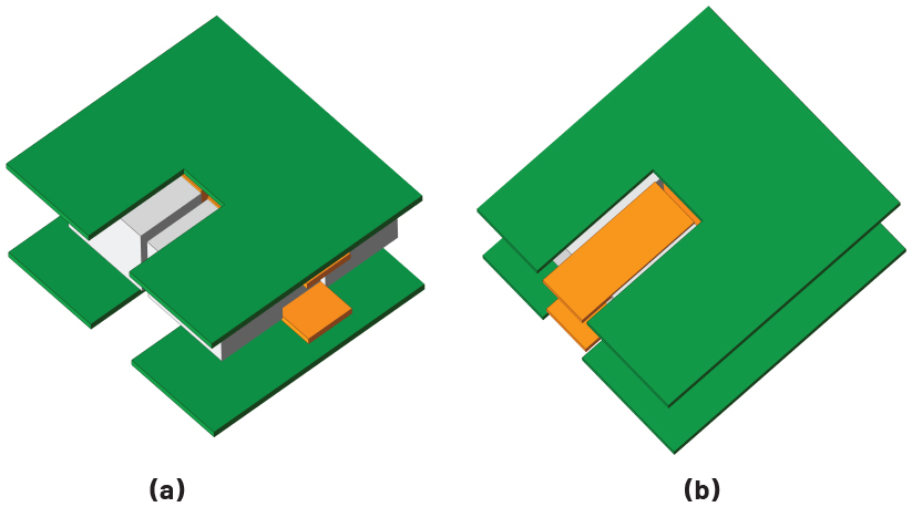▲그림 9. 기판 내 다층 구리 구조: (a) 8층, (b) 7층