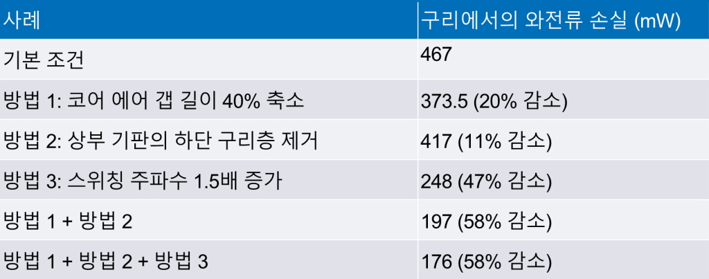 이 방법을 통해 감소되는 와전류 손실은 표 5과 같다. 다만 이러한 방식의 단점은 인덕터의 포화 전류(saturation current)가 낮아질 수 있다는 점이다.