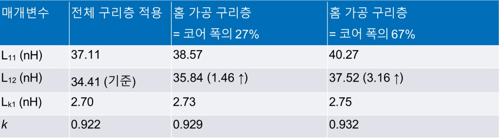 이러한 와전류가 인덕턴스 변화에 미치는 개별적인 영향을 평가하기 위해, 그림 6과 같이 해당 위치의 구리층에 홈(groove)을 도입했다.