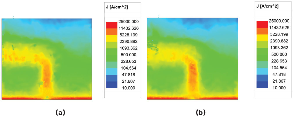 ▲그림 8. 상부 구리층에서의 와전류 밀도: (a) (lg = 0.25) ㎜, (b) (lg = 0.15) ㎜