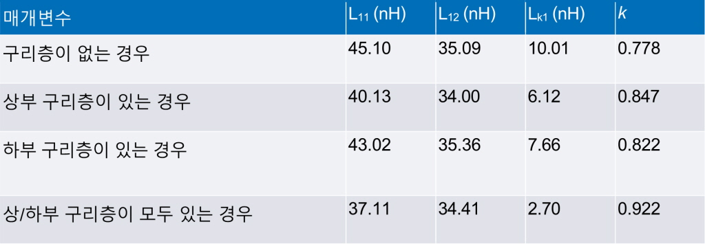 표 1에서 볼 수 있듯이 상부 구리층은 하부 구리층보다 자기 코어와 권선에 더 가까이 위치하기 때문에 누설 인덕턴스와 자기 인덕턴스에 더 큰 영향을 미친다.