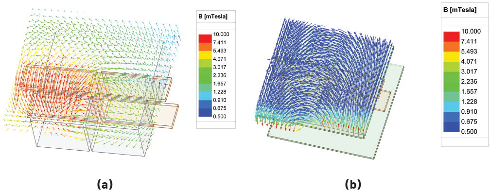 ▲그림 7. 홈이 가공된 구리층이 적용된 경우 코어 상부의 자속 밀도(B-필드) 분포: (a) 코어 에어 갭 인근, (b) 권선 인근