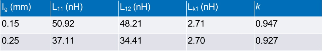 자기 인덕턴스(L11), 상호 인덕턴스(L12), 누설 인덕턴스(Lk1), 결합 계수(k)를 포함한 시뮬레이션 인덕턴스 값은 하나의 사례를 기준으로 표 1에 정리되어 있다.