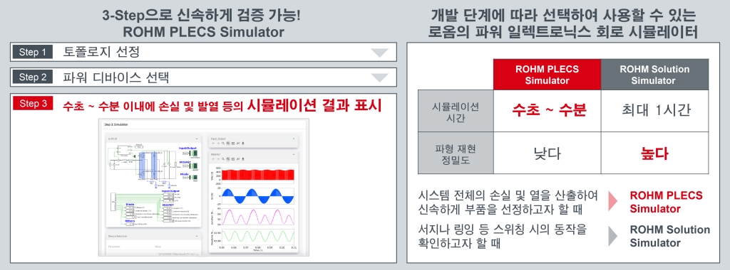 로옴은 앞서 파워 디바이스와 IC를 함께 검증할 수 있는 ‘ROHM Solution Simulator’를 운영해 왔다. 이번에 공개한 PLECS 기반 툴은 손실과 열 계산 중심의 초기 검토에 무게를 두고, 기존 툴은 보다 세밀한 파형 검증에 활용하는 방식으로 역할을 나눈 것으로 볼 수 있다.