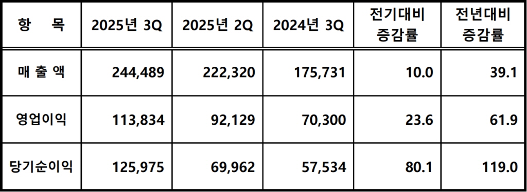 ▲SK하이닉스 2025년 3분기 경영실적(단위 : 억원, %, 연결재무제표 기준)