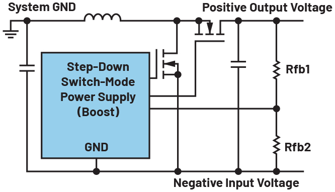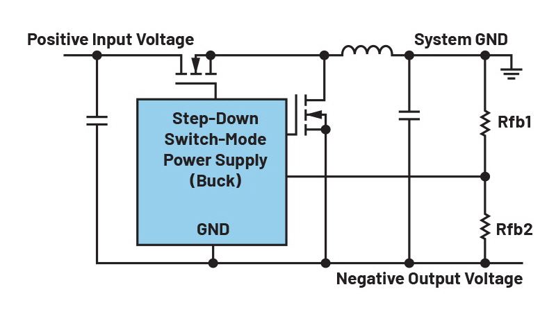 벅 레귤레이터의 출력 전압은 시스템 접지(GND)에 연결되고, GND 핀 전압은 음 전압이 되는데, 이는 저항 분배기 Rfb1과 Rfb2를 통해 조정할 수 있다.