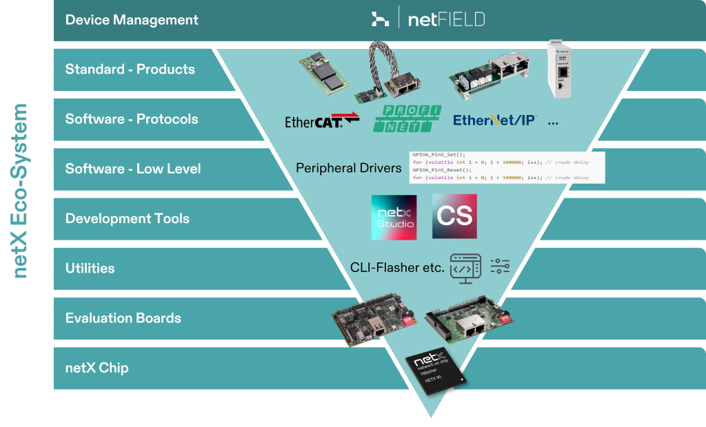 netX 칩 플랫폼은 통신 프로세서, 소프트웨어·펌웨어 솔루션, 컨설팅·교육·기술지원 등 3개 축으로 구성된다.