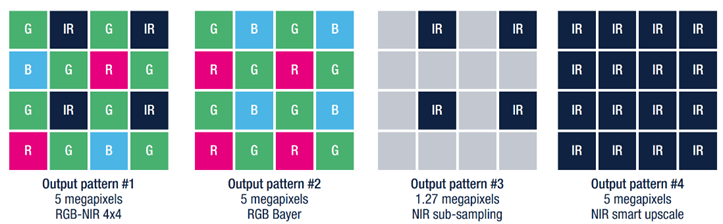 센서는 구성 가능한 출력 포맷을 다양하게 지원하며, 최대 해상도 5MP RGB-NIR 4×4 픽셀 그룹화, 네이티브 5MP RGB Bayer 패턴, 1.27MP NIR 서브샘플링, 5MP NIR 스마트 업스케일 모드 등이 있다.
