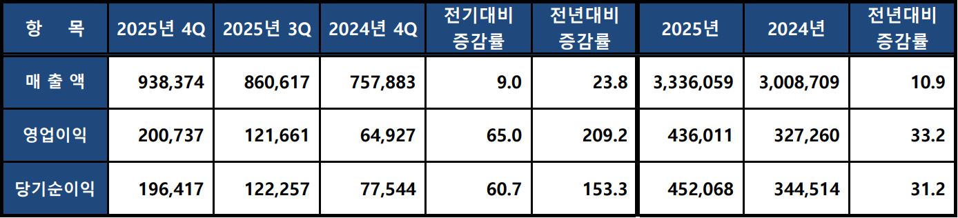 2025년 4분기 매출은 93조9,374억원으로 전년대비 23.8% 증가했고, 영업이익은 20조737억원으로 209.2% 증가했다. 당기순이익은 19조6,417억원으로 153.3% 증가했다.