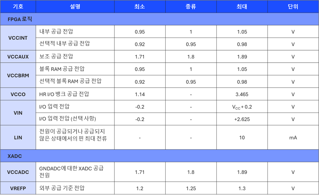 앞서 제시된 두 표([표1]과 [표2])에서 확인할 수 있듯이 FPGA의 전압 규정은 매우 엄격하다.