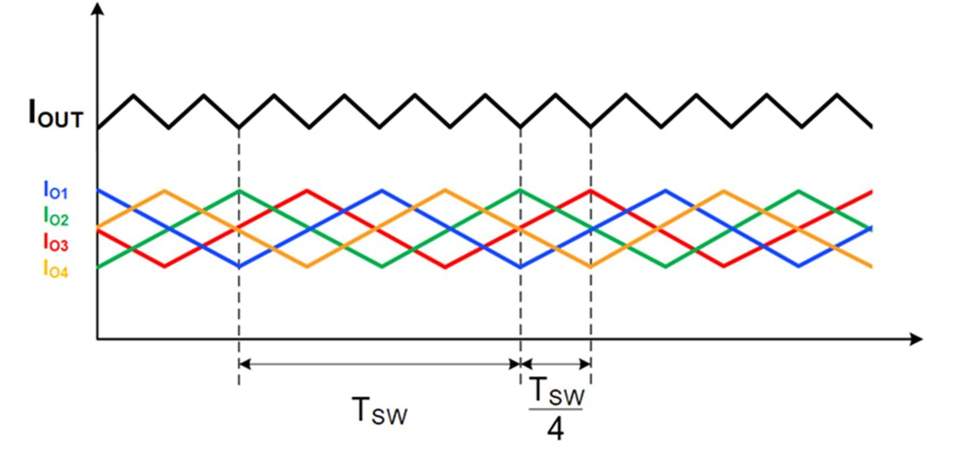 예를 들어 4상 애플리케이션의 경우를 살펴보면, 총 인덕터 전류 리플(IOUT = IO1 + IO2 + IO3 + IO4)은 개별 위상의 리플보다 4배 작아지며, 리플 주파수는 개별 위상 주파수보다 4배 증가한다(그림1 참고).