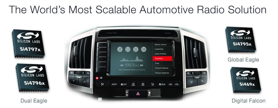 실리콘랩스의 새로운 제품군에 기반한 OEM 및 애프터마켓 라디오 설계 제품들은 저가형 싱글 튜너 AM/FM 라디오로부터 다중 튜너와 안테나를 지원하는 고성능 시스템으로 확장이 가능하기 때문에, 자동차용 라디오 공급업체들은 공통 소프트웨어 API를 이용하여 자신들의 R&D 노력을 다양한 제품 라인에 적용할 수 있다.