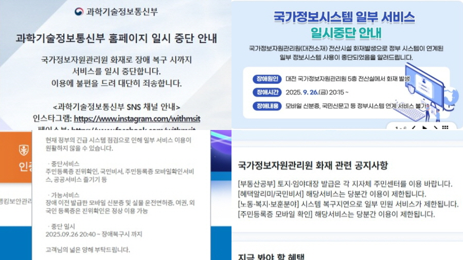 이번 화재로 정부24, 모바일 신분증, 무인민원발급기, 국민신문고, 각 부처 홈페이지 등 주요 대국민 서비스가 모두 중단됐다.