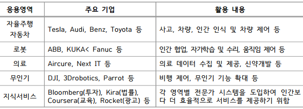 주요 응용영역내 주요 기업과 인공지능 기술 활용 내용(출처 ETRI 인공지능 기술과 산업의 가능성 보고서)