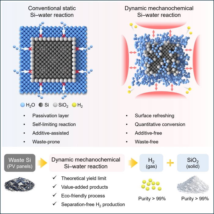 실리콘은 물과 반응해 수소와 실리카를 만들 수 있지만, 표면에 형성되는 실리카 피막이 반응을 막아 수소 생산량이 크게 제한돼 왔다. 연구팀은 강한 화학약제를 쓰지 않고도 이 피막을 제거할 수 있는 기계화학적 공정을 고안했다. 작은 구슬이 들어 있는 용기에서 실리콘과 물을 함께 굴려 충돌을 유도하는 방식으로, 실리카 보호막을 반복적으로 제거해 반응을 지속시킨 것이다.