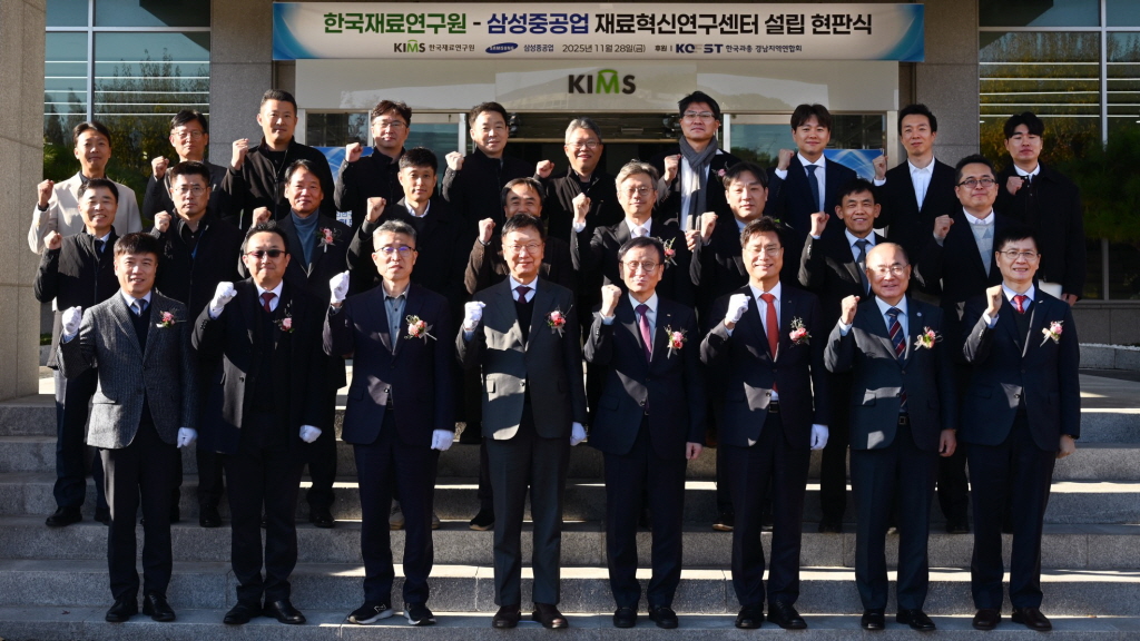 한국재료연구원(KIMS, 원장 최철진)과 삼성중공업(SHI)이 손을 잡고 ‘KIMS-SHI 재료혁신연구센터’를 설립하고, 지난 11월28일 경남 창원 한국재료연구원 본원에서 현판식을 개최했다.