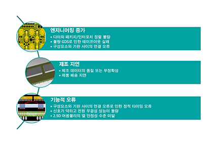 FOWLP, 실리콘 인터포저, CoWoS 및 WoW와 같은 HDAP 신기술을 이용하려면 여러 설계 팀이 서로 협력하여 개별적인 요소들뿐 아니라 시스템 전체를 한꺼번에 최적화해야 합니다. 이러한 신기술에는 자연히 새로운 난관도 뒤따르기 마련이며, 기업체와 설계 팀에서는 이러한 문제점들을 직면하여 극복해야 합니다. 그와 같은 난제를 크게 세 가지 범주로 나눌 수 있습니다. (* 왼쪽 그림 참고)