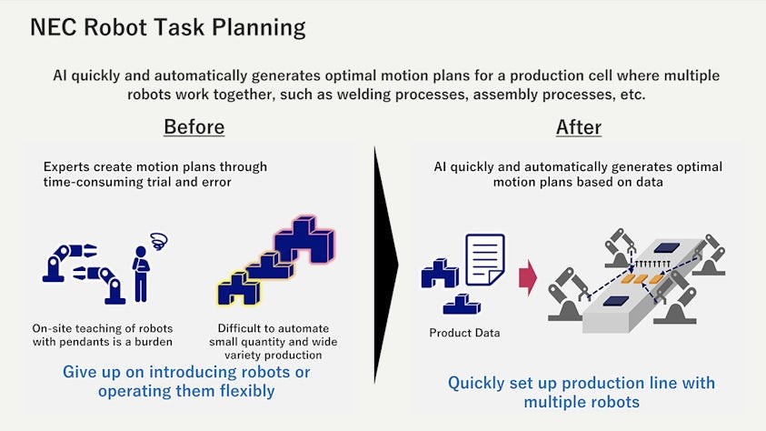 NEC의 로봇 태스크 플래닝은 블루스텔라(BluStellar) 이니셔티브의 일환으로 개발된 기술로, 다수의 로봇이 협력 작업을 수행할 수 있도록 최적화되어 있다. 이번 통합을 통해 해당 기능은 지멘스의 Process Simulate 인터페이스에 자연스럽게 연결되며, 클릭 한 번으로 로봇 동작 계획을 생성할 수 있는 사용자 경험을 제공한다.