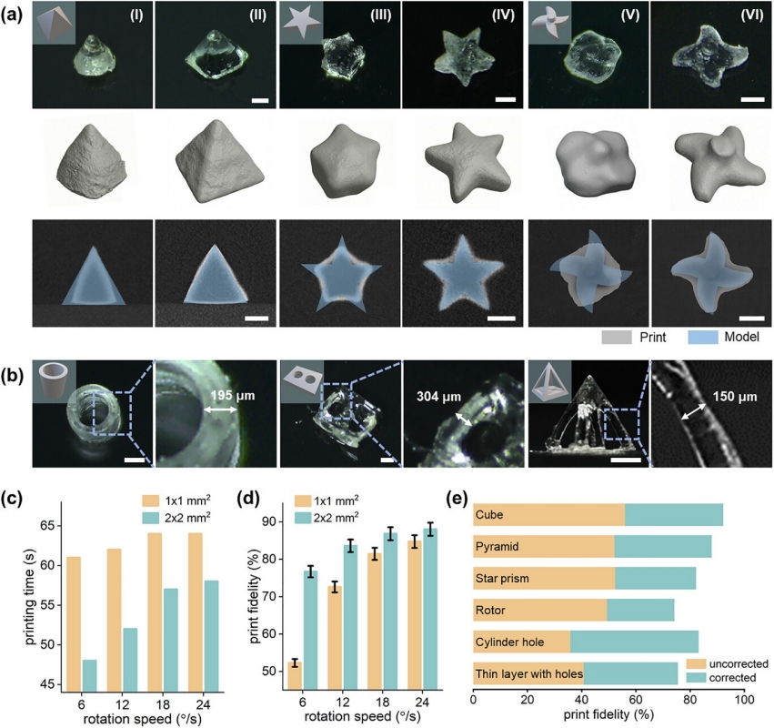 DVAM은 유리 피펫 끝에 형성된 광경화성 수지 방울을 인쇄 공간으로 활용한다. 연구팀은 회전하는 액적에 계산된 빛 패턴을 조사해 구조물을 경화한 뒤, 완성된 구조물을 기판 위로 배출하고 다음 액적을 공급하는 방식으로 연속 공정을 구현했다.