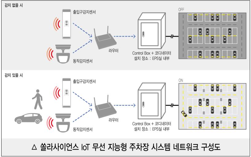 LED조명 전문 ㈜쏠라사이언스(대표이사 송성근)가 IoT 무선 절전시스템 기업 ㈜커누스(대표이사 박창식)와 공동으로 IoT 무선 지능형 주차장 시스템을 개발했다.