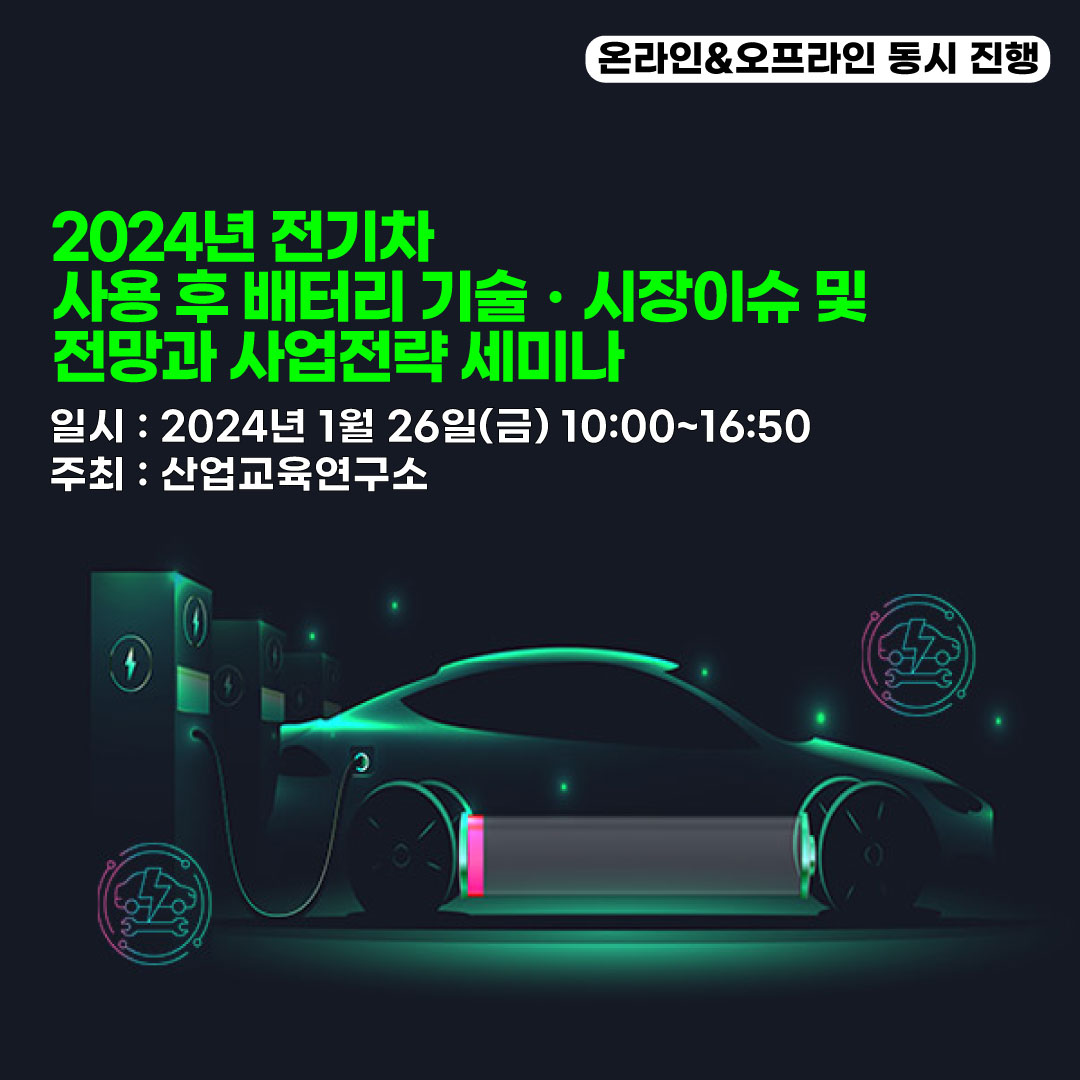 산교연은 오는 26일에 ‘2024년 전기차 사용 후 배터리 기술ㆍ시장이슈 및 전망과 사업전략 세미나’를 온·오프라인 동시 개최한다고 5일 밝혔다.