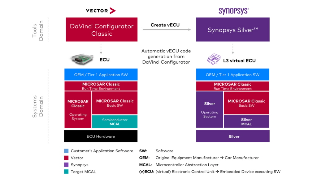 벡터의 ‘MICROSAR Classic’과 시높시스의 ‘Synopsys Silver’를 통합 제공함으로써, 실제 하드웨어 없이도 초기 개발 단계부터 ECU를 생성하고 테스트할 수 있는 환경을 구현했다.