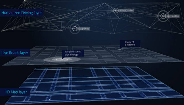 ▲Here의 HD Live map은 클라우드 기반의 실시간 맵 기술로 정밀 GPS, 3D 표면 검지 기술 등을 활용한다.