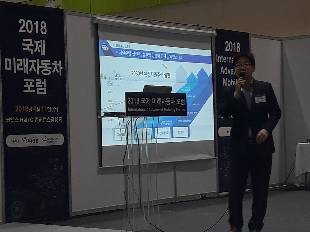 국토교통부 김창기 사무관이 국제 미래자동차 포럼에서 상용화 추진 방향을 설명하고 있다.
