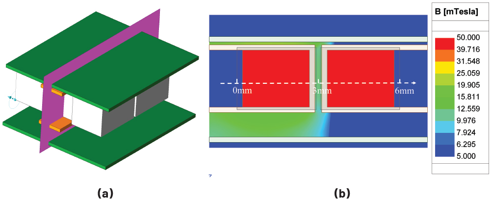 ▲그림 7. 홈이 가공된 구리층이 적용된 경우 코어 상부의 자속 밀도(B-필드) 분포: (a) 코어 에어 갭 인근, (b) 권선 인근