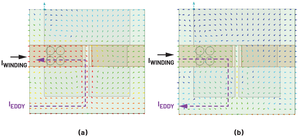예를 들어 그림 11에서 볼 수 있듯이 권선 바로 위에 위치한 8번 하위층의 구리 영역에서는 와전류가 권선 전류와 반대 방향으로 흐르지만, 4번 하위층에서는 와전류가 권선 전류와 같은 방향으로 흐르게 된다.