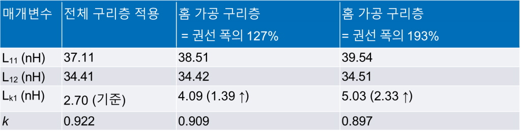 ▲표 2. 코어 에어 갭 상부에 홈 가공 구리층을 적용했을 때 시뮬레이션 인덕턴스 값