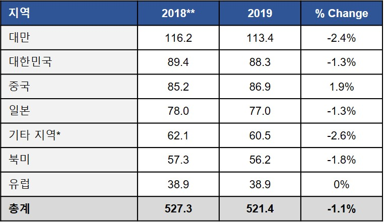 ▲ 2018년, 2019년 지역별 반도체 재료 시장 규모