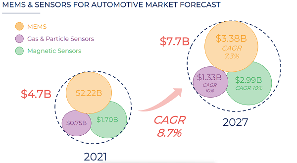 MEMS의 경우 2021년 22억2,000만달러의 시장에서 2027년 33억8,000만달러로 연평균 7.3% 성장할 것으로 전망됐고, 마그네틱 센터의 경우 2021년 17억달러에서 2027년 29억9,000만달러로 연평균 10% 상승할 것으로 전망됐다.