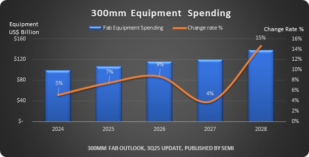 올해 300㎜ 팹 장비 투자는 사상 처음으로 1,000억 달러를 돌파할 것으로 보이며, 전년 대비 7% 증가한 1,070억 달러에 이를 것으로 예상된다.