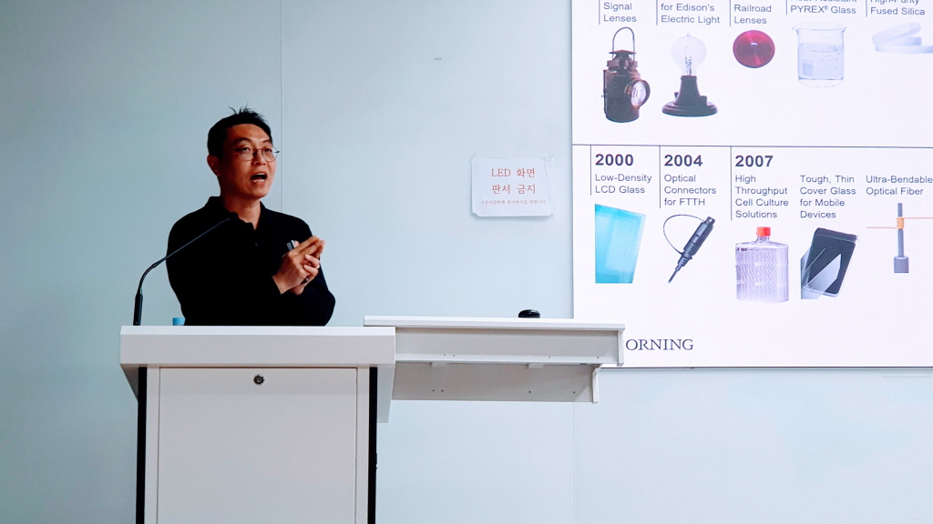 ▲석성호 코닝정밀소재 수석이 ‘Corning TGV(Through Glass Via) Substrate:Innovation solutions for advanced packaging’을 주제로 발표하고 있다.