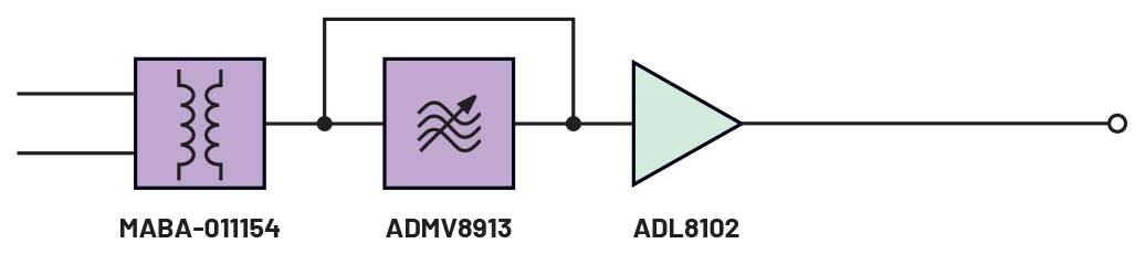 ▲그림 3. ADMV8913, ADL8100, ADRF5730을 포함하는 수신기 신호 체인 블록 다이어그램